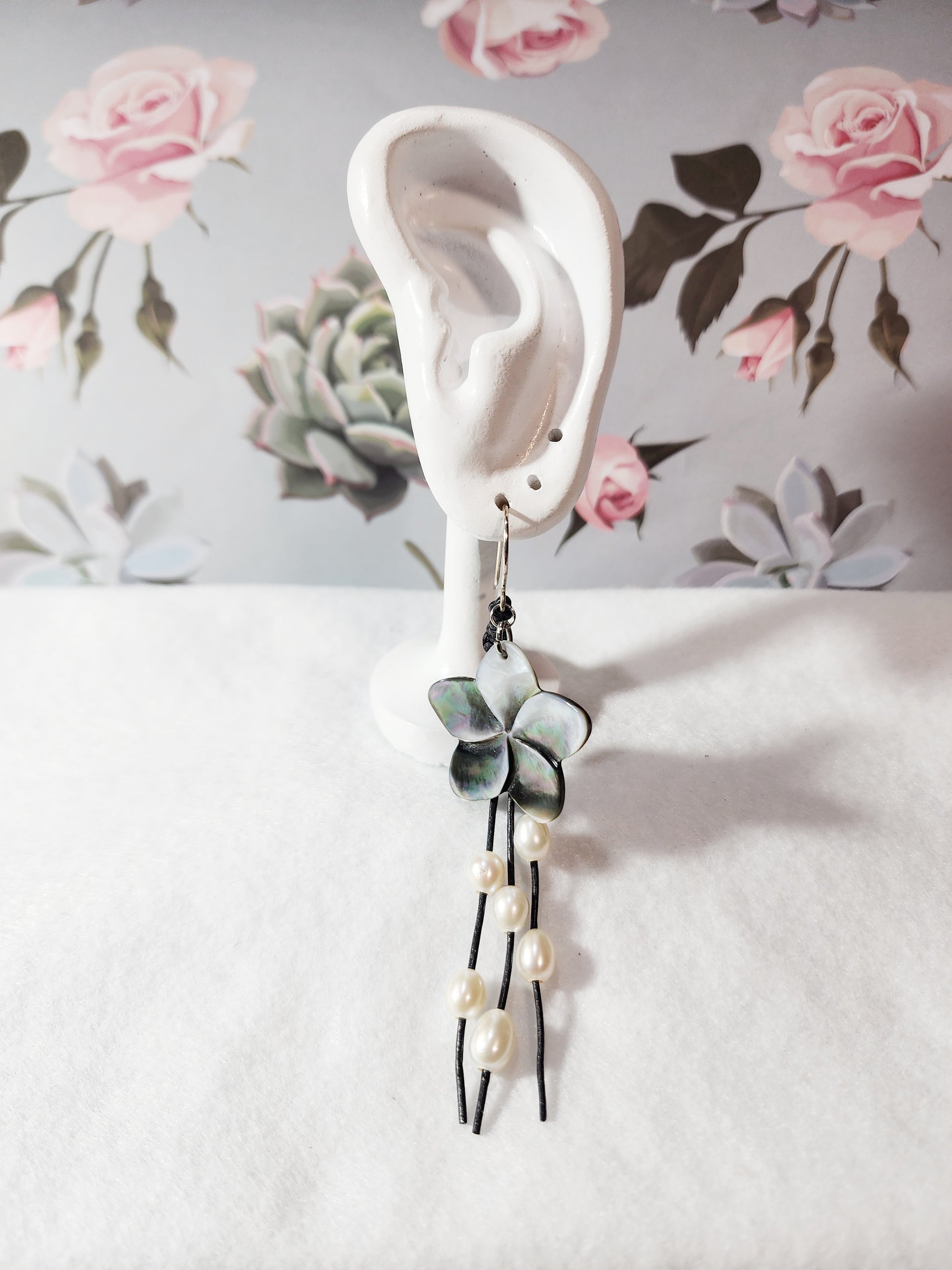 Carved black shell, freshwater pearls, black leather, and hand made sterling silver hooks.